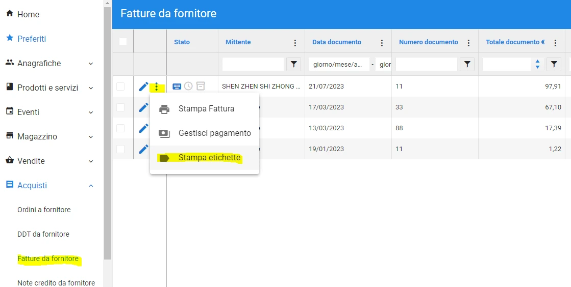 - Clicca sull’icona Strumenti (⋮) in corrispondenza della fattura ricevuta e seleziona Stampa etichette.