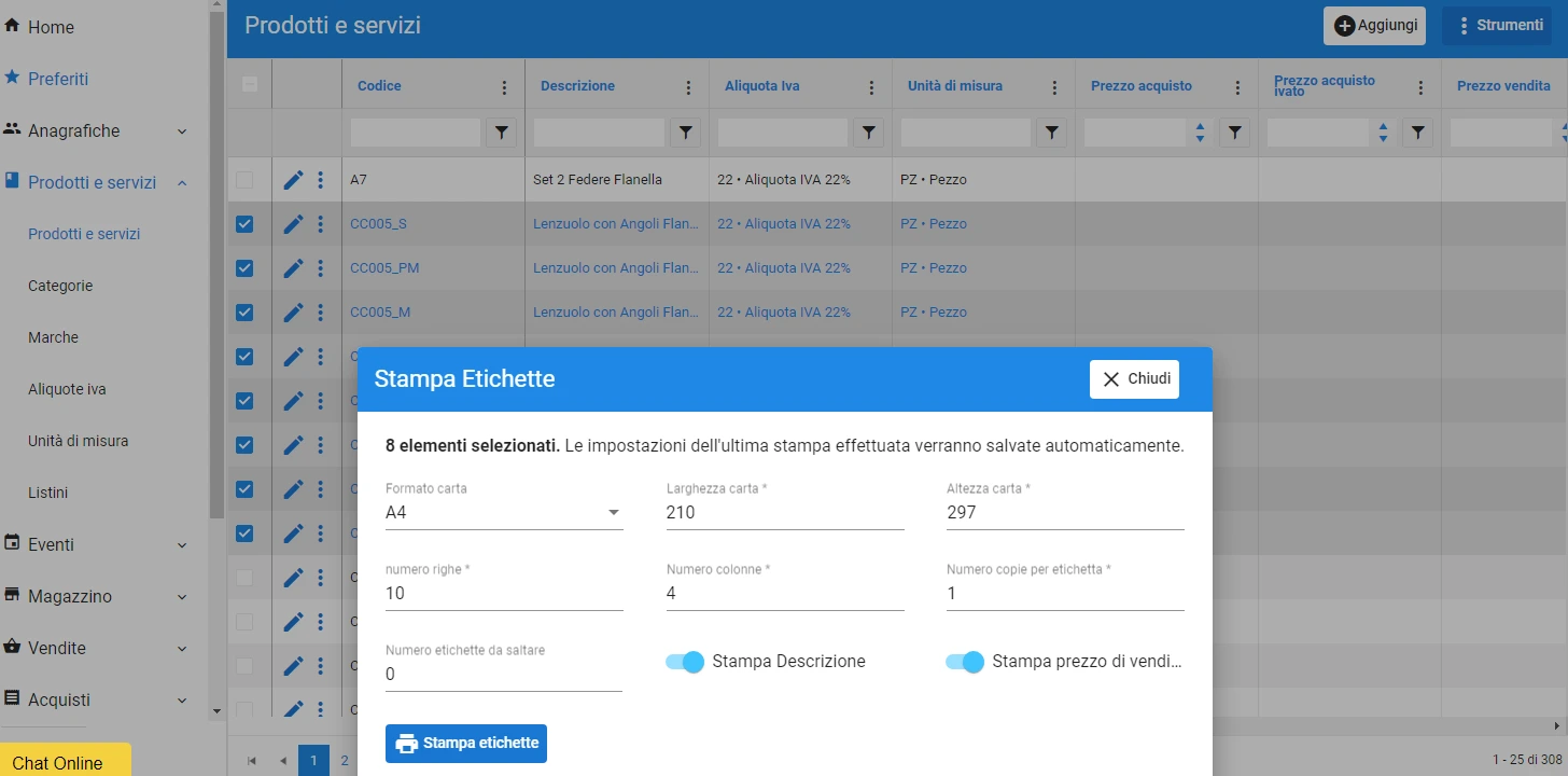 La funzione Stampa etichette ti consente di ottenere etichette chiare, leggibili e personalizzate in pochi clic, sia a partire dai tuoi prodotti e servizi, sia direttamente dalle fatture dei fornitori.