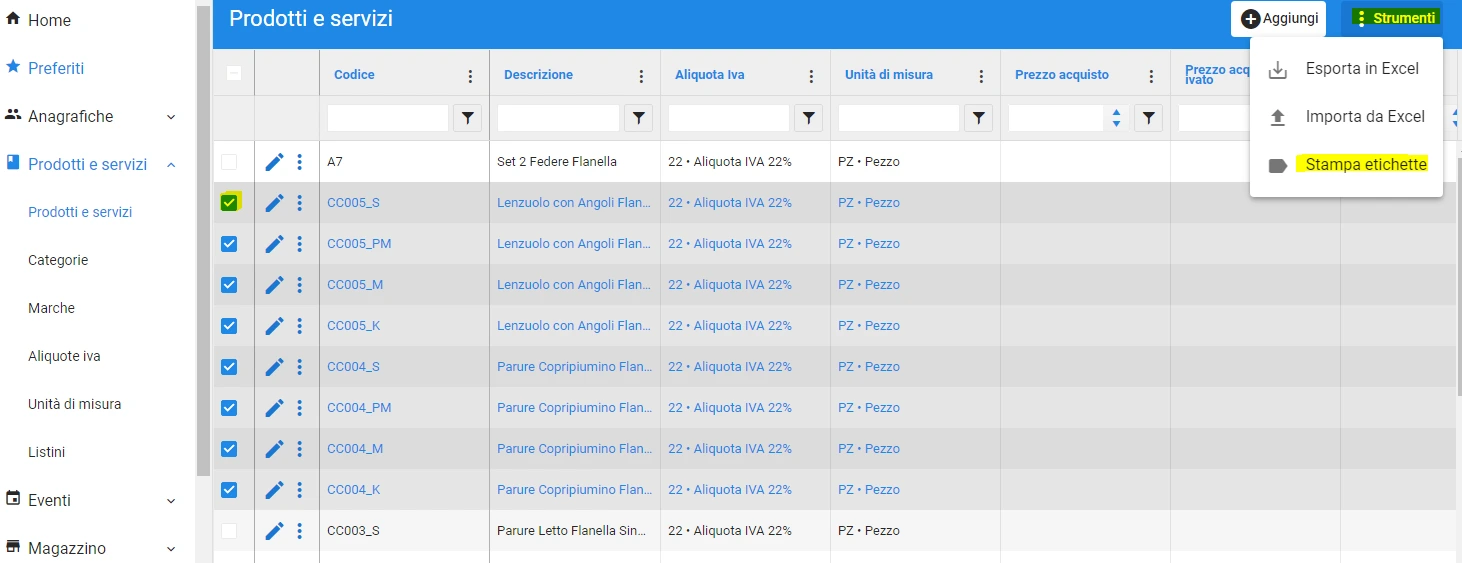 - Seleziona i prodotti di cui desideri stampare le etichette, spuntandoli sulla sinistra dell’elenco.